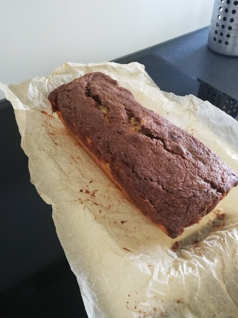 Ik bakte een cake. Dit is een marmercake. Als ik cake (of iets dergelijk) bak, gebruik ik altijd bakpapier. Ik verfrommel het en steek het even onder de kraan. Uitwringen en daarna kan je het makkelijker in de cakevorm doen. Na het bakken is de cake ook veel makkelijker uit de vorm te halen. 😉