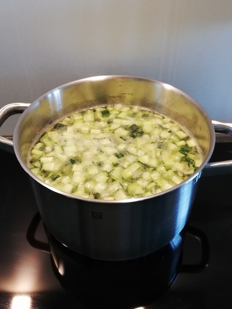 Het was tropisch warm buiten en ik maakte soep. Komkommersoep deze keer, want de komkommers stonden in reclame bij Aldi.