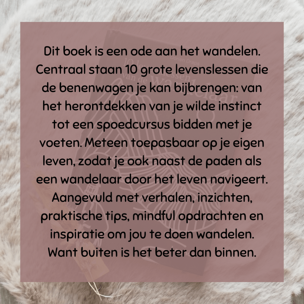 Zoals de titel al zegt, geeft Dorien je de 10 levenslessen van de wandelaar mee. Het is een mix van weetjes, inspiratie en motivatie. Dit doet ze op een soepele, vlotte manier zonder belerend over te komen. Daarnaast is er ook veel aandacht besteed aan de vormgeving van het boek. Er staan namelijk heel wat mooie tekeningen in.