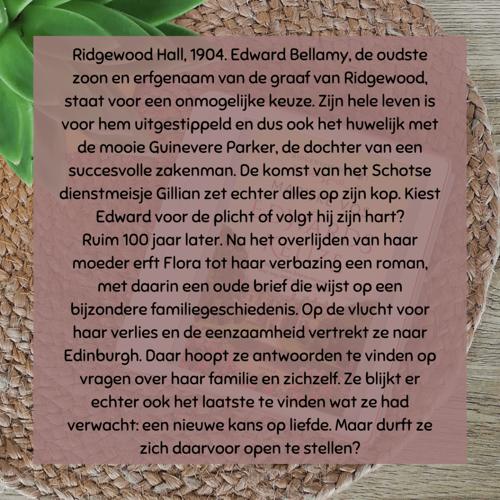 In het heden volgen we Flora. Na de dood van haar moeder ontvangt ze met de erfenis een gesigneerd boek van ene oma Elisabeth. Ze vraagt zich af waarom haar moeder haar dit gaf. Uiteindelijk besluit ze om naar Edinburgh af te reizen, de plaats waar haar opa geboren is. Ze duikt in haar familiegeschiedenis en die blijkt toch wel heel dicht te komen bij Ridgewood Hall…