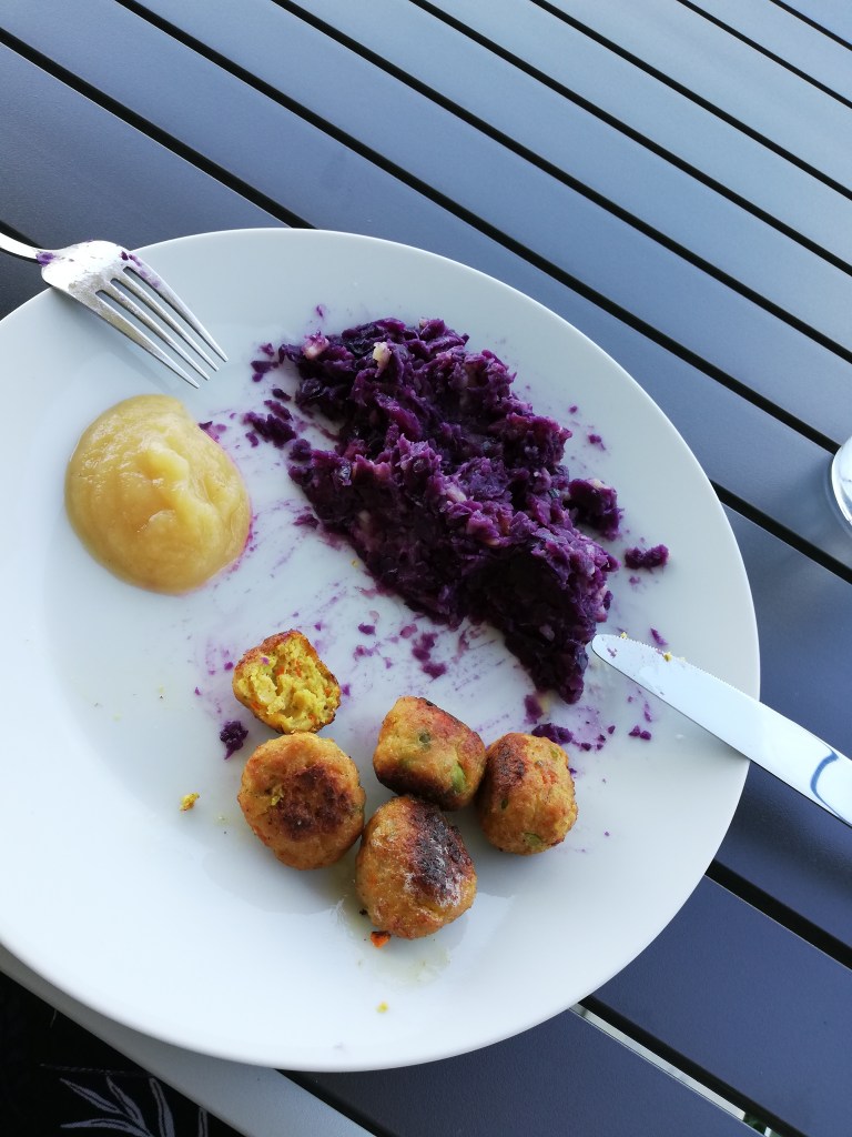 De eerste deftige maaltijd, in de zin van AVG (aardappelen, vlees/vega en groenten) was dit. Gekookte aardappelen, rode kool, groenteballetjes en appelmoes.