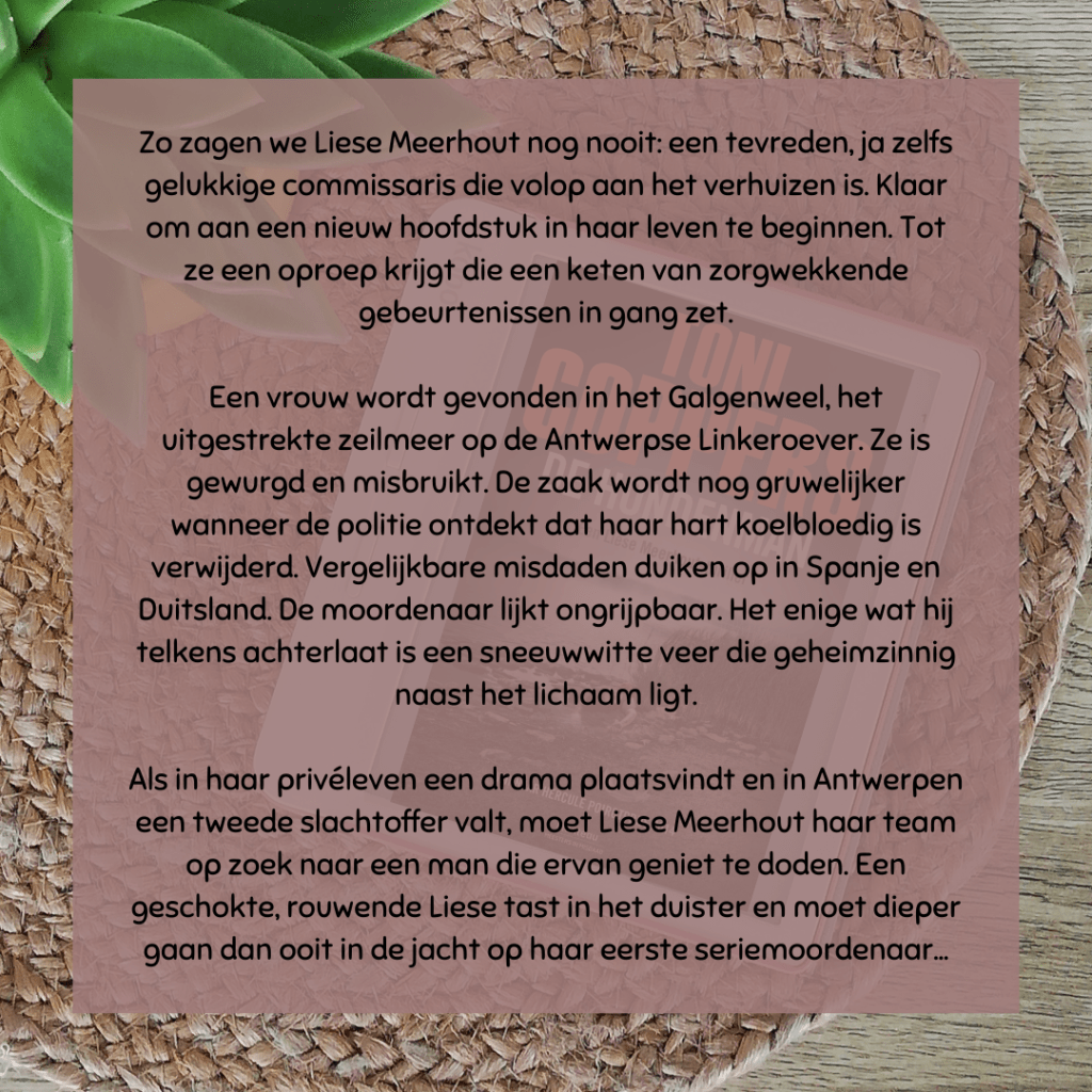 Ik begin waar ik zo’n 8 jaar geleden geëindigd ben. De eerste 9 boeken uit de Liese Meerhout-serie heb ik met veel plezier gelezen. Sommige boeken waren gesigneerde exemplaren die ik kocht op de Antwerpse Boekenbeurs, andere boeken kwamen uit de bib. Hoog tijd dus om deze serie verder te zetten. 🙂