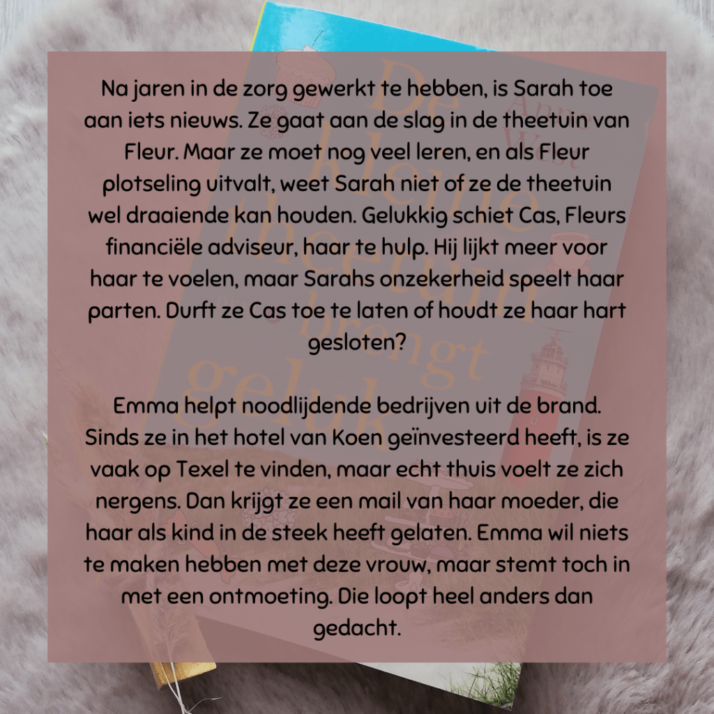 De kleine theetuin brengt geluk is een bijzonder fijne feelgood met een diepere laag. Je voelt je thuiskomen op Texel en na het lezen van het verhaal wil je terug. Gelukkig komt er nog een 4de deel van deze fijne serie. Ik kijk er al naar uit! 😊