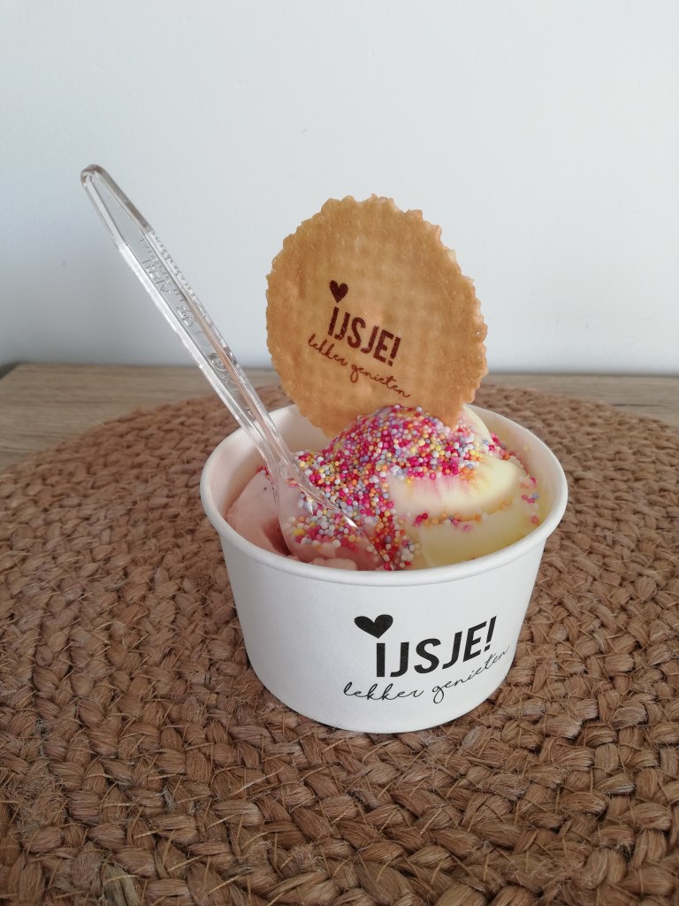 Dit was het laatste ijsje van het seizoen. Een potje met een bolletje aardbei en een bolletje vanille, afgewerkt met spikkeltjes/discobolletjes.