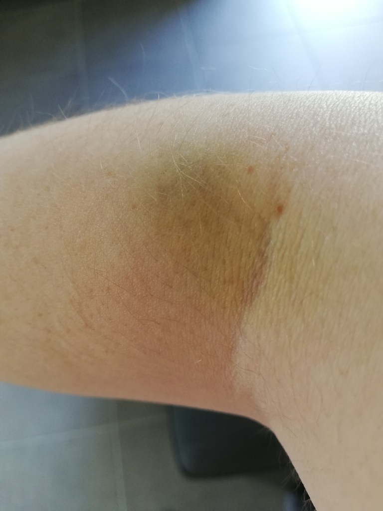 Ik bracht een bezoekje aan de huisarts. Enerzijds voor de verlenging van mijn arbeidsongeschiktheid, anderzijds voor een bloedafname. Dat resulteerde trouwens in een grote blauw plek… 😉