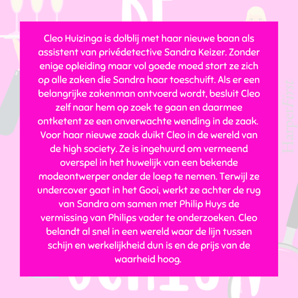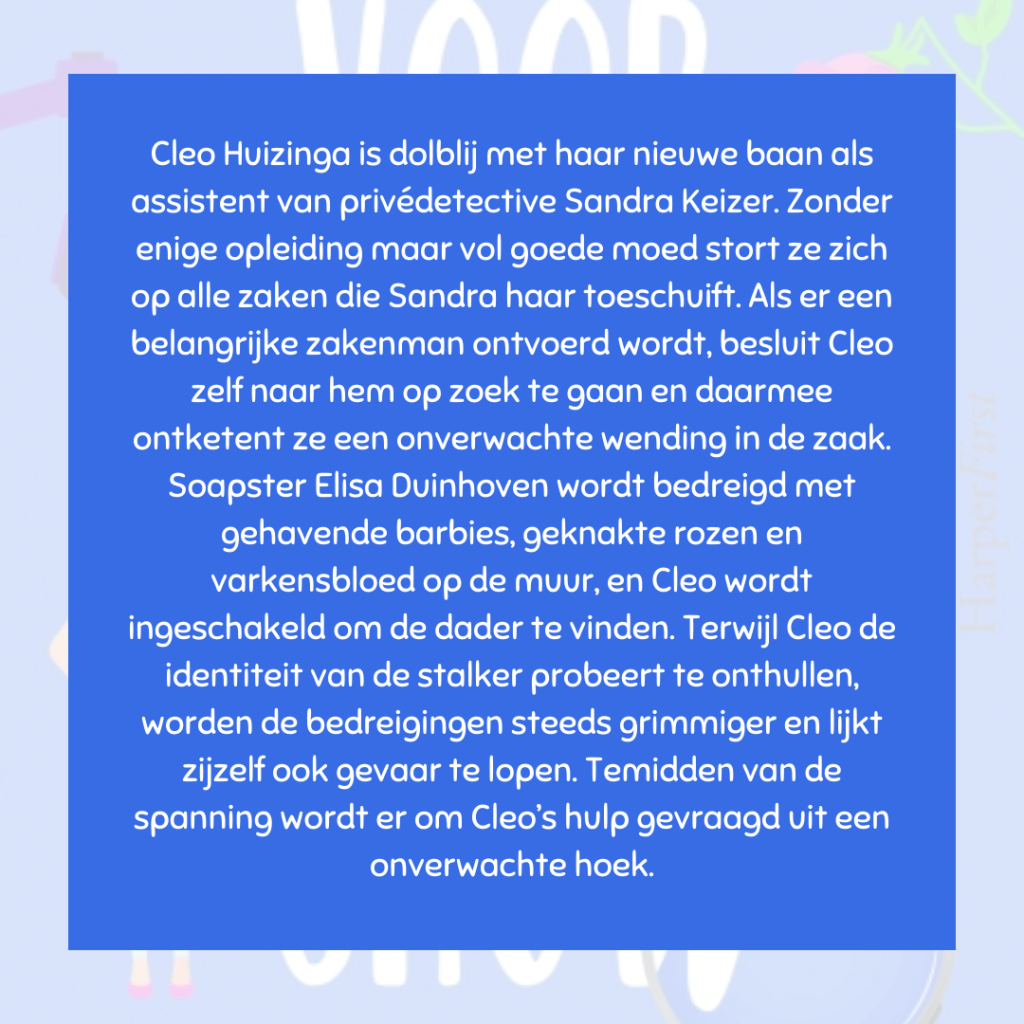 Weer een heerlijk verhaal in de Cleo Huizinga-serie. Het zit vol met lachwekkende situaties, maar ook de romantiek komt al een beetje kijken. Het blijft ook spannend afwachten hoe de zaak Huys zal verdergaan. Op naar deel 5! 😊