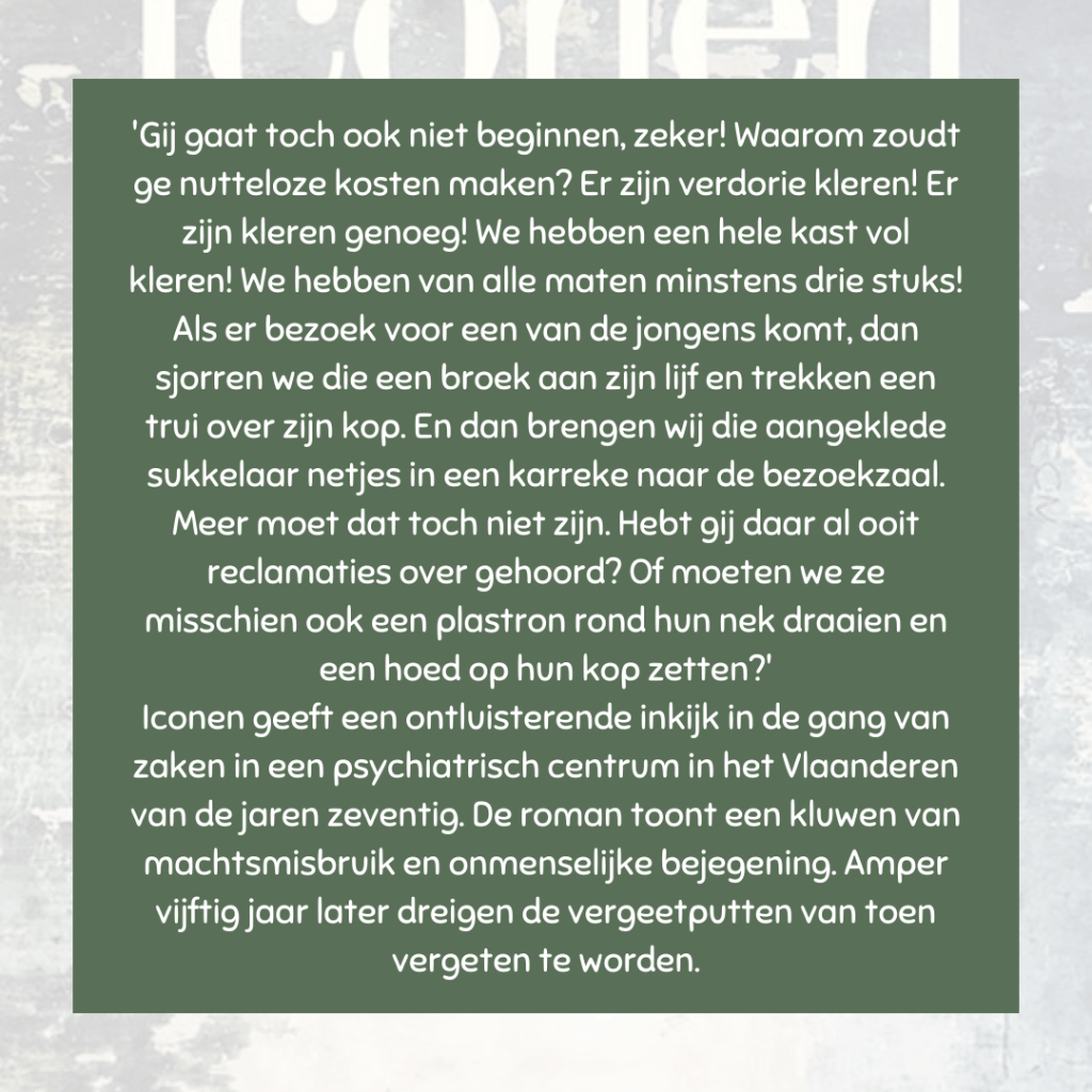 Enkele jaren geleden las ik reeds Suikerspin van deze auteur in de leesclub van de bibliotheek. Toen ik zag dat Erik Vlaminck een nieuwe roman heeft uitgebracht met als onderwerp psychiatrie in de jaren’ 70 was mijn nieuwsgierigheid voldoende gewekt.