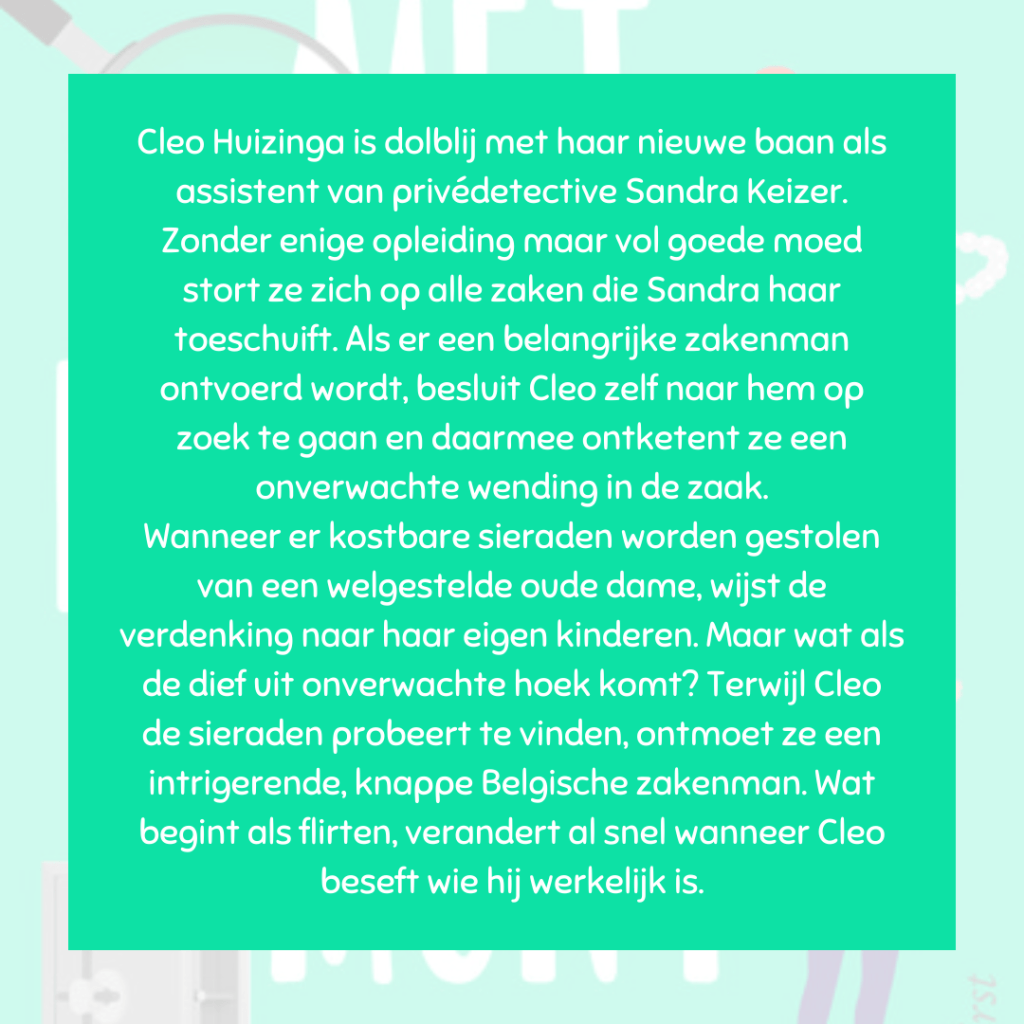 Daar is Cleo Huizinga weer. Privédetective en bijna-partner van haar baas Sandra Keizer. Of dat denkt ze toch… Tot haar teleurstelling wordt ze weer op een kleine zaak gezet, maar ze zal eens laten zien wat ze in huis heeft.