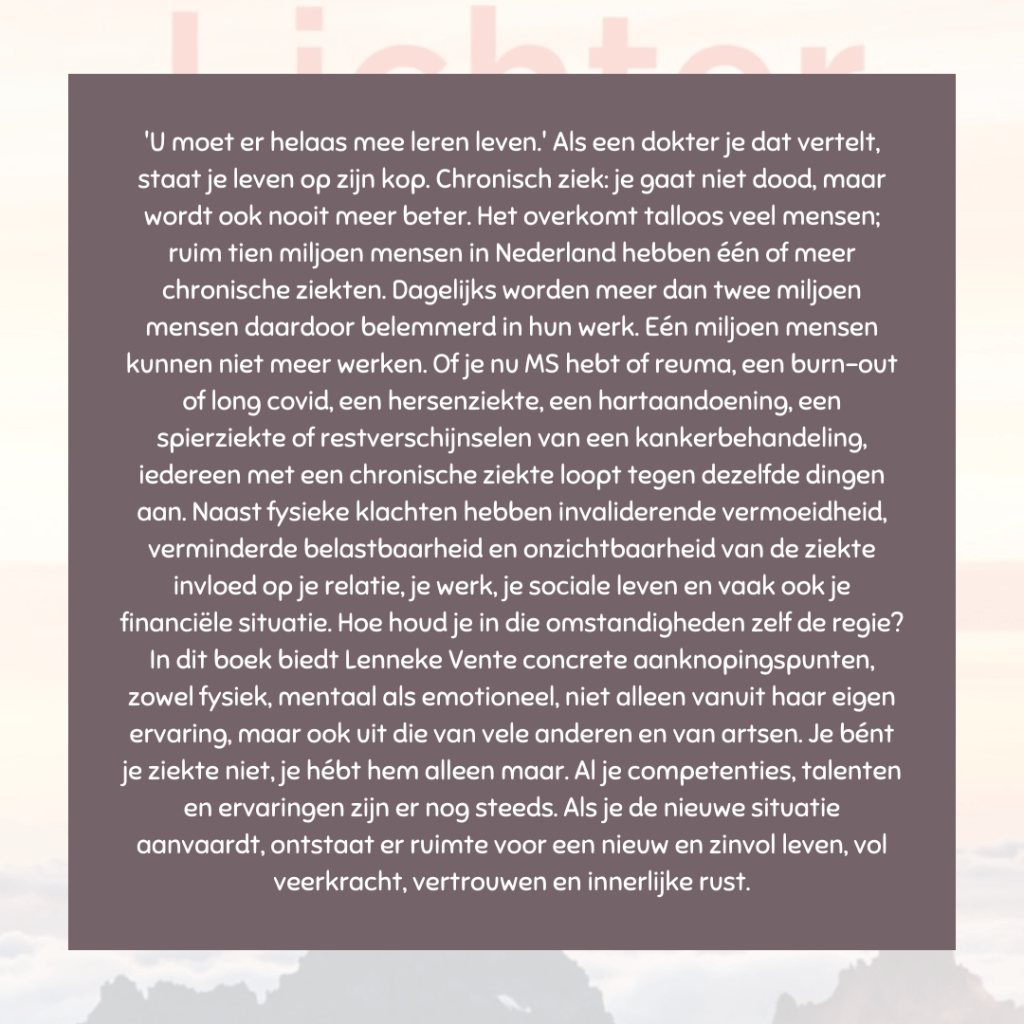 In dit boek reikt Lenneke, zelf chronisch ziek, handvaten aan om lichter te leven met een chronische ziekte. Ze laat ook andere mensen met een chronische ziekte aan het woord.