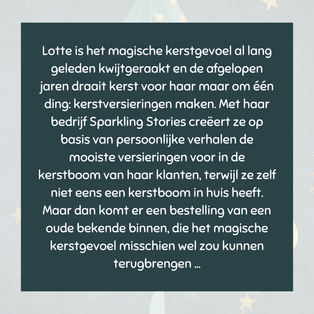 Lotte runt het bedrijfje Sparkling Stories. Ze maakt kerstversiering met herinneringen. Zelf heeft ze niets met kerst na een akelig voorval in haar tienerjaren. Maar dan zorgt Alex, de organisator van de kerstmarkt, voor fijne nieuwe herinneringen en kan ze voor het eerst in jaren weer een beetje genieten van kerst. Totdat er weer een akelig voorval gebeurt, denkt ze toch…