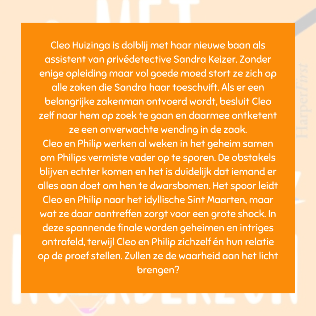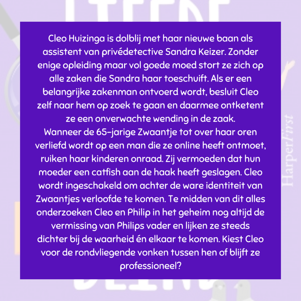 Met de serie Cleo Huizinga, privédetective heeft Marijke Vos een origineel verhaal neergeschreven. Het bevat humor, romantiek, spanning en veel fantasie. Dit laatste deel heeft een heel goede ontknoping waardoor ik de serie alleen maar kan aanraden.