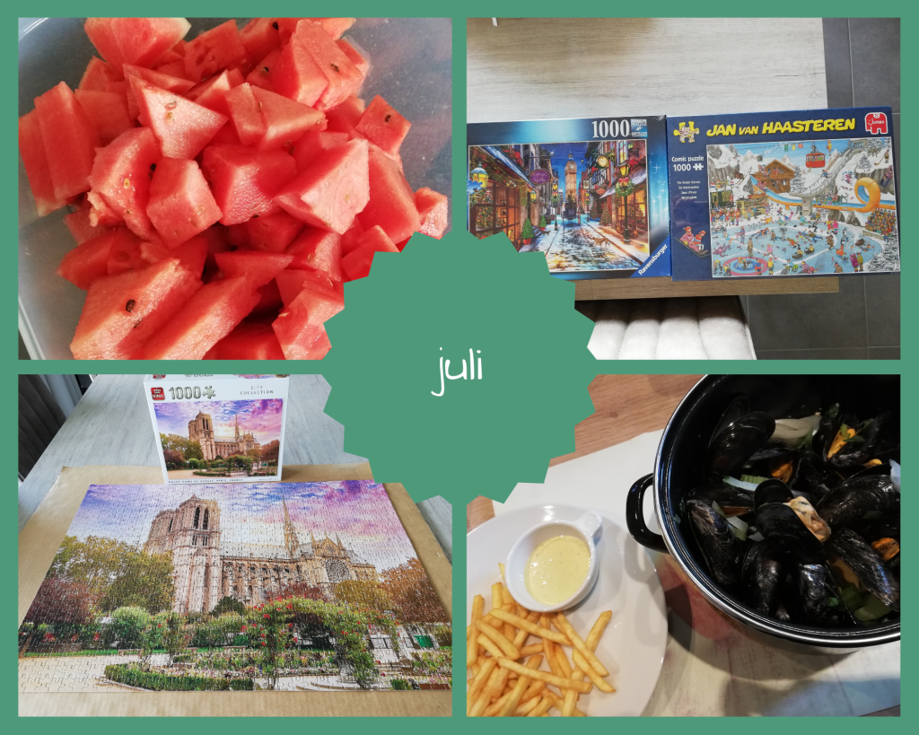 Juli was een natte zomermaand, dus dan moeten we de zomer maar in huis halen met lekker zomerfruit. Ik eet graag watermeloen, maar zo’n gigantisch ding krijg ik niet alleen op. Een miniwatermeloen kost dan nog eens stukken van mensen. Ik koop het dus enkel als het in promo staat.