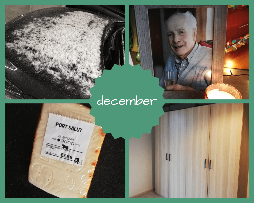 De kerstsfeer was in december dus ver te zoeken. Het verdriet overheerste. Toch hebben we samen met de familie kerst gevierd, dat zou vava gewild hebben. Op kerstdag was de menu een kaas- en vleesschotel. Ik ben geen kaaseter, maar ik wilde wel eens proeven. Op aanraden van de familie proefde ik de Port Salut en ik vond het best lekker. Later die week kocht ik het lichtste blokje in de AH om het verder te leren eten.
