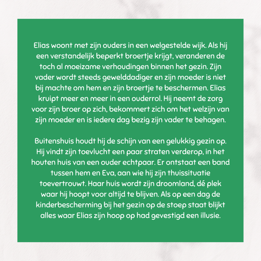 De mooie en vloeiende schrijfstijl van Valentijn de Heer is een pareltje voor het lezende oog. Hij neemt je mee doorheen de opgroeiende jaren van Elias. Hij kruipt in de huid van Elias en weet zo het schrijnende verhaal nog meer naar voren te brengen.