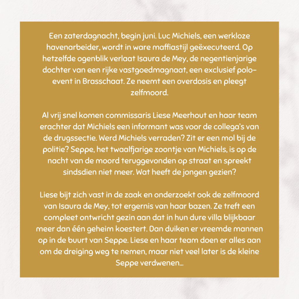 Commissaris Liese Meerhout en haar team krijgen een gruwelijke moord voorgeschoteld. Luc Michiels is op een beestige manier afgemaakt. Zijn zoontje Seppe blijft alleen achter nadat zijn moeder enkele maanden geleden al overleed. Al snel wordt duidelijk dat er een link is met drugs en werken team Moord en team Drugs heel nauw met elkaar samen. Vlak daarna wordt er nog een gruwelijke moord gepleegd en blijkt Seppe zelf het doelwit te zijn, aangezien hij misschien wel getuige was van iets. Op hetzelfde moment pleegt Isaura De Mey zelfmoord. Deze zaak is niet echt voor het team van Liese, maar ze kan het niet laten om er zich mee te moeien.