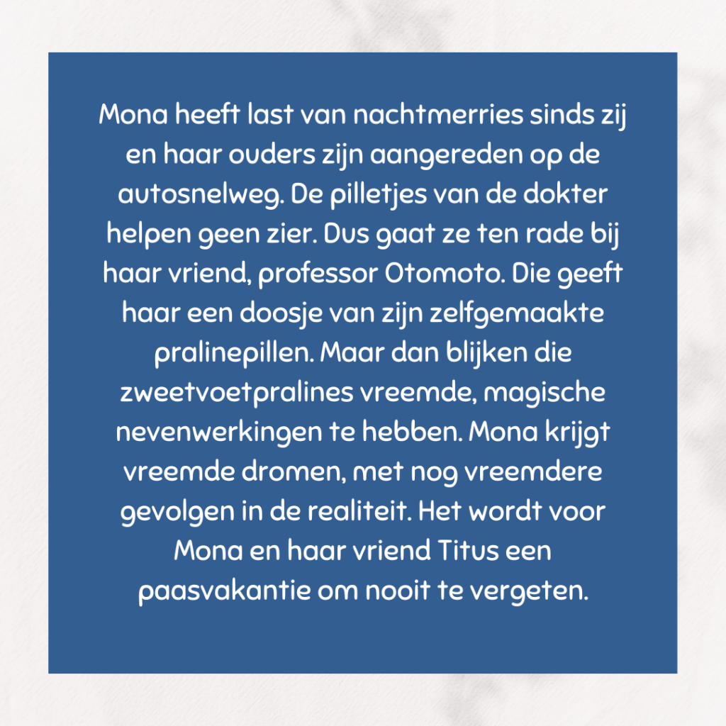 Deze keer heeft Mona last van nachtmerries na een auto-ongeluk. Hiervoor heeft ze zweetvoetpralines van professor Otomoto gekregen. Het staat nog niet helemaal op punt en Mona krijgt een bijwerking. Ze droomt ’s nachts iets dat de volgende dag uitkomt. Lottocijfers, een flamingo die landt op het dak van de frituur,… De pers smult ervan. Door deze dromen komt ze wel in gevaar, want sommige mensen willen misbruik maken van haar buitengewone kracht…
