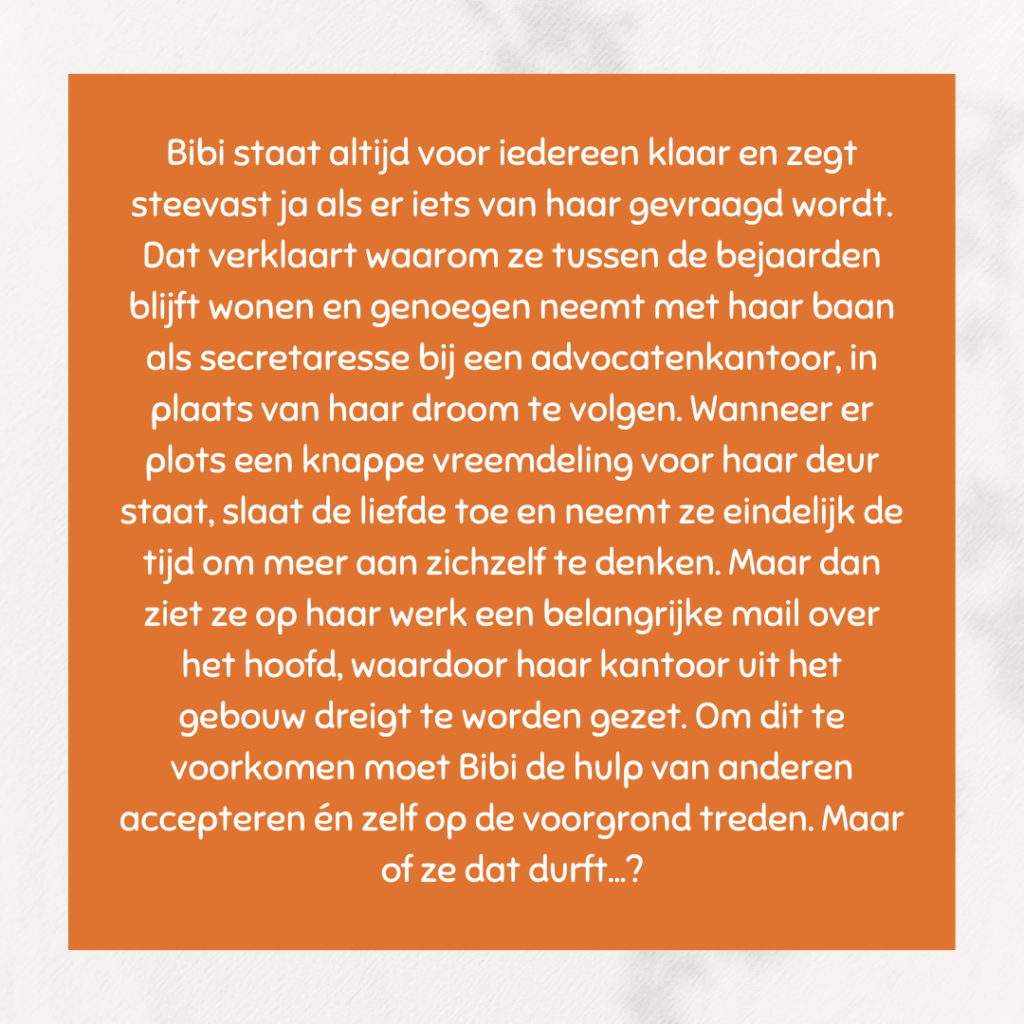 Bibi woont in een woongroep voor bejaarden. Tussen de oudjes beleeft ze heel wat avonturen en ontmoet ze Jasper, de knappe kleinzoon van één van de bewoners. Maar er zijn kapers op de kust. Daarnaast ziet ze een mailtje over het hoofd dat grote gevolgen heeft voor het bedrijf waar ze werkt…