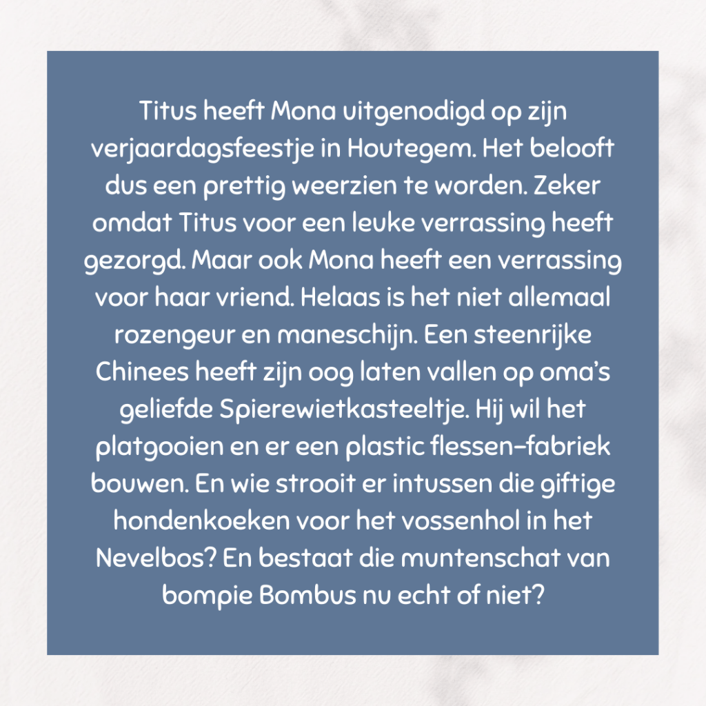 In dit nieuwe verhaal beleeft Mona weer een groot avontuur. Het kasteeltje in Houtegem wordt verkocht. Een Chinees bedrijf heeft er belangstelling voor om er een plasticfabriek neer te zetten. De burgemeester, door de dorpsbewoners ook wel Napolitana genoemd omdat ze niet echt meeleeft met hen, vindt het een uitstekend plan. Wat zouden de dorpsbewoners het plannetje graag willen boycotten. Maar hoe?