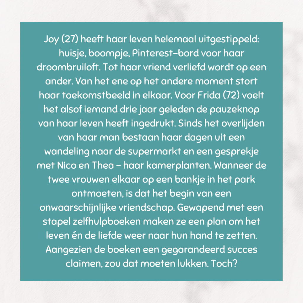 Het verhaal is origineel. Naast de locatie, een woongroep voor bejaarden, neemt het verhaal ook verrassende wendingen. Een fervente feelgoodlezer weet al snel hoe een verhaal zal lopen: pas vanaf de helft van het boek komen de hoofdpersoon en de antagonist samen, er gebeurt iets waardoor ze uit elkaar gaan om dan weer samen te komen. Lindi Melse heeft dit echter anders aangepakt, wat dus zorgt voor die verrassende wendingen.