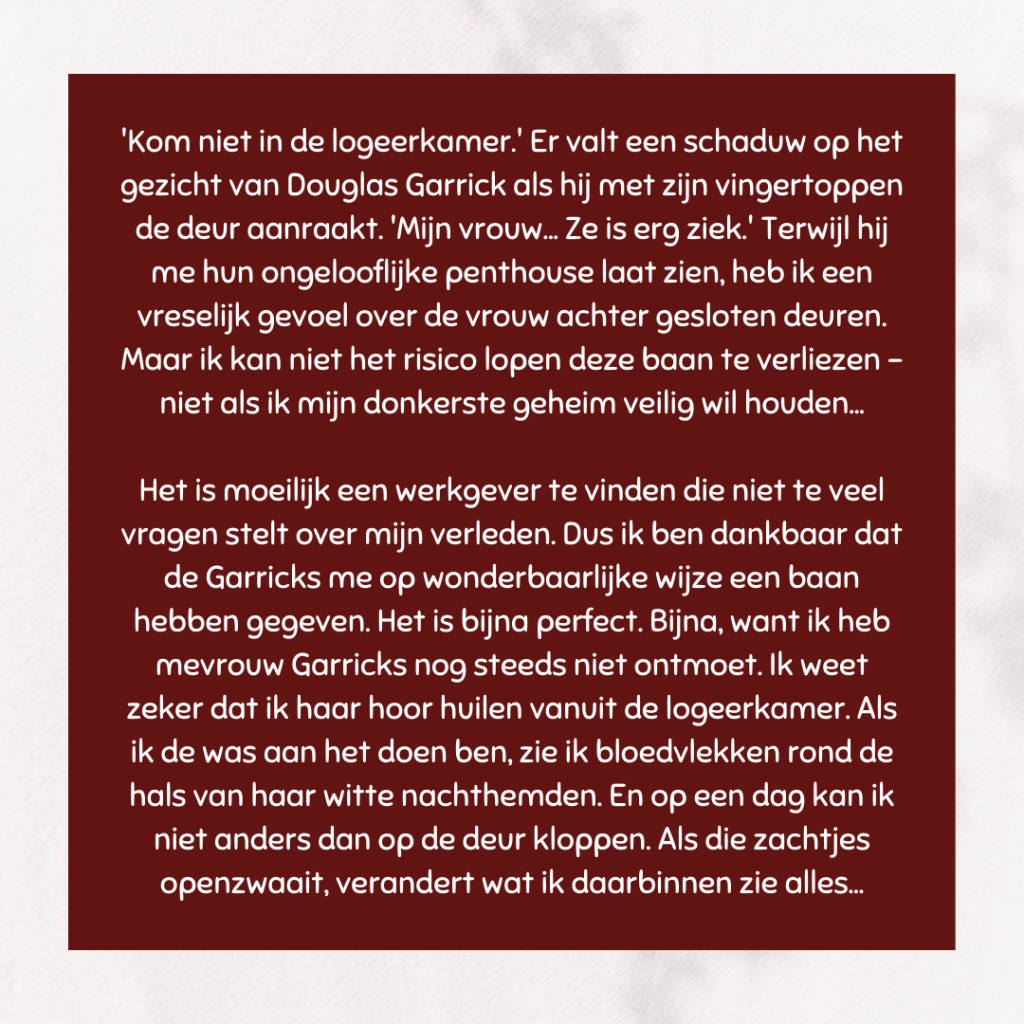 De schrijfstijl van Freida McFadden is beeldend en bevat humor. Ik moest altijd lachen met hoe een personage ´broccoli´ (echte naam was Broke) genoemd werd. De personages zijn ook goed uitgeschreven.