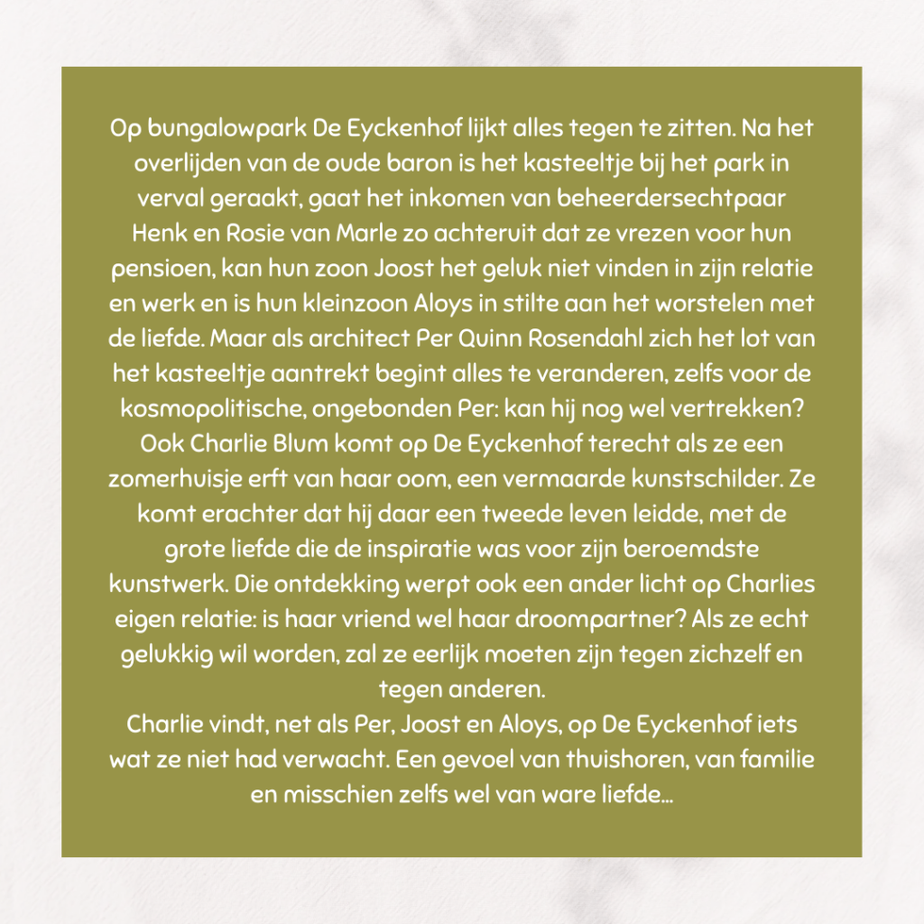 De schrijfstijl is beschrijvend en enorm beeldend. Vanaf het eerste moment waan je je op het vakantiepark. De vakantiesfeer komt opzetten. Ik wilde niets liever dan mijn koffers pakken en naar De Eyckenhof trekken.