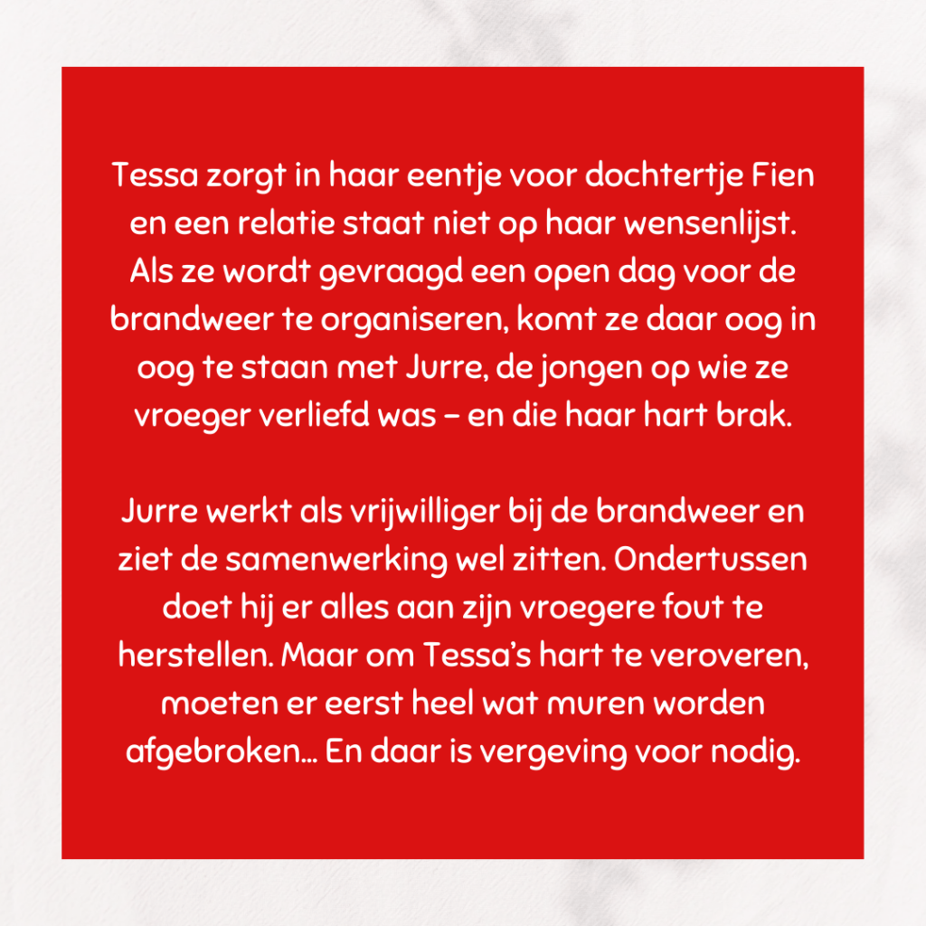 In dit deel leren we Tessa, de zus van Abel uit het eerste deel, kennen. Ze is een alleenstaande moeder van een 8-jarige dochter Fien. Ze is vastbesloten om altijd met z´n tweetjes te blijven. Geen man in haar huis. Daarnaast werkt ze bij de VVV van Reggeveld. Ze vindt het leuk om mensen wegwijs te maken in het prachtige Twente. Op een dag krijgt ze de opdracht om mee de opendag van de plaatselijke brandweer te organiseren. Daarvoor krijgt ze hulp van een vrijwilliger. Haar verbazing is groot als het Jurre blijkt te zijn. Jurre, haar oude buurjongen en de man waarop ze altijd verliefd is geweest. Wat moet ze nu doen?