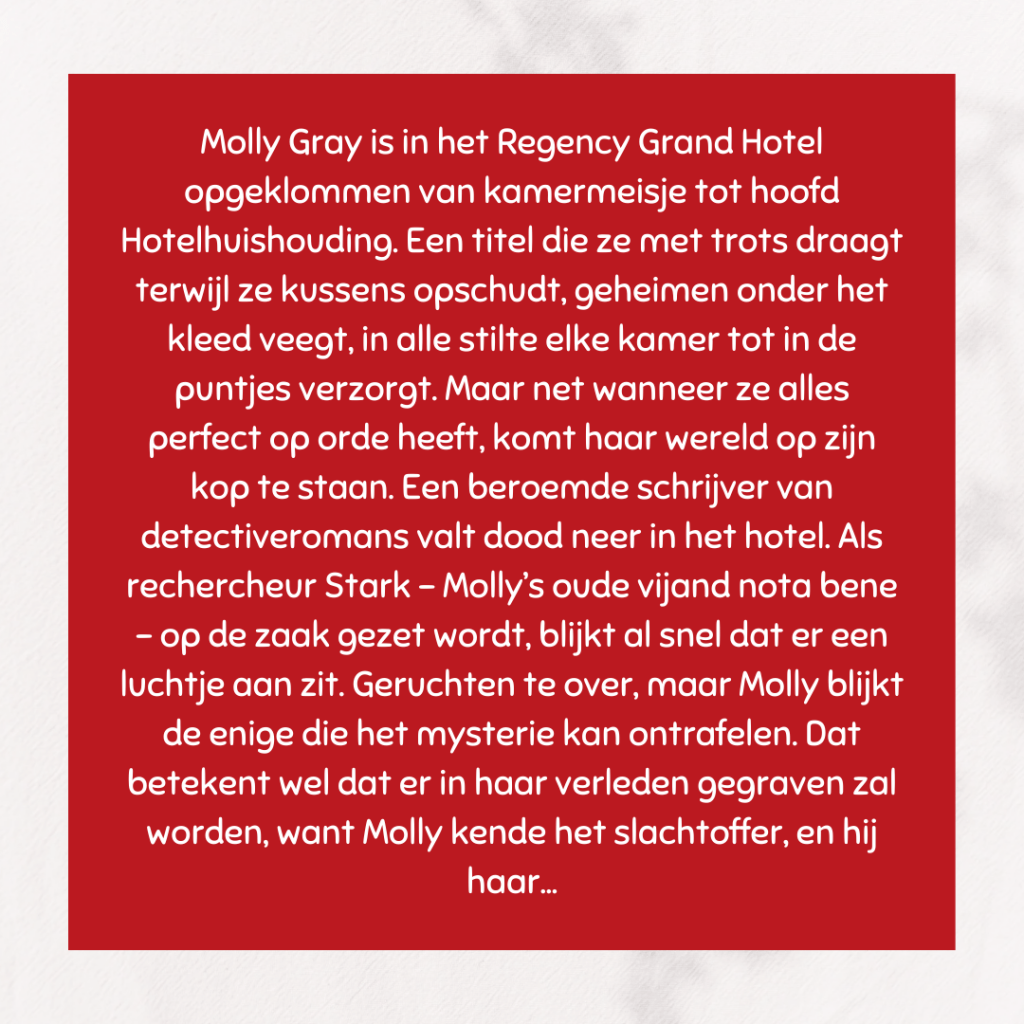 Welkom terug in het Regency Grand Hotel. Kamermeisje Molly is ondertussen hoofd Hotelhuishouding en leidt haar team kamermeisjes op een perfecte manier. Op een dag roept bestsellerauteur Mr. Grimthorpe de pers bijeen om een onthulling te doen. Vooraleer hij dit kan doen, zakt hij neer op de grond. Dood. Rechercheur Stark, geen onbekende voor Molly, neemt de zaak op zich. Wat is er gebeurd?