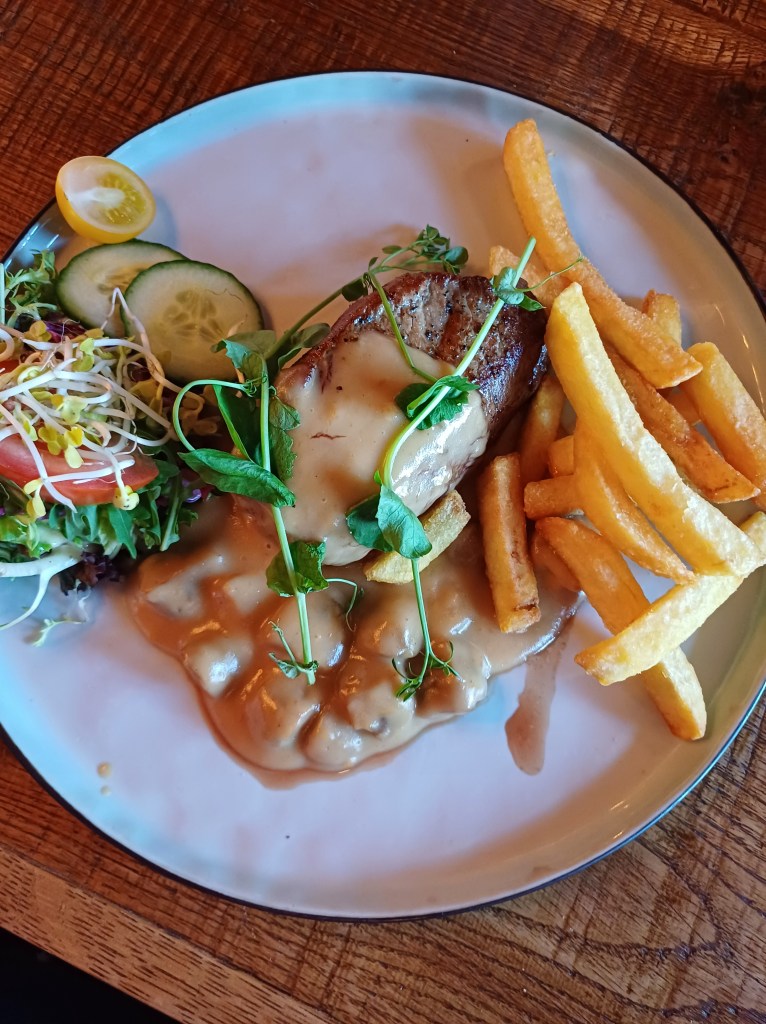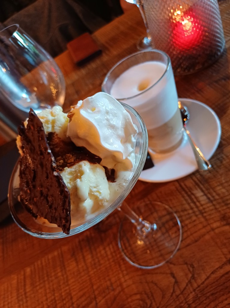 ’s Avonds gingen we nog eens uiteten. Het laatste avondmaal. Ik at steak met champignonsaus en als dessert een dame blanche.