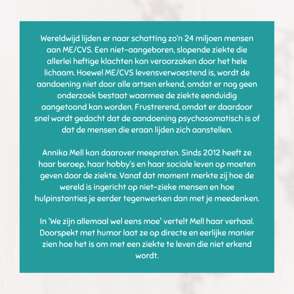 Annika heeft ME, myalgische encefalomyelitis. Ze kan nog maar weinig. Ze is chronisch moe en heeft helse pijnen. Ik heb MS, multiple sclerose. Één letter verschil, maar wat herkende ik veel in haar verhaal. Het maakte me zelfs wat emotioneel.