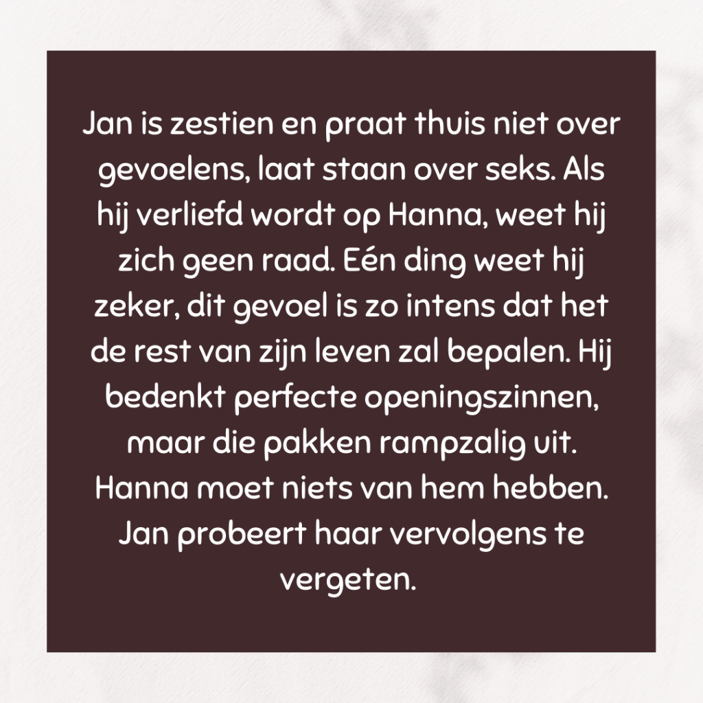 In dit boek ontmoeten we Jan, een tiener in volle ontwikkeling. Hij haalt goede cijfers voor wiskunde, maar Engels is een ramp. Na school trekt hij graag de natuur in om vogels te spotten. Hij wordt ook verliefd op Hanna. Maar hij weet niet wat te doen. Hoe maakt hij zoiets duidelijk? Het lijkt wel alsof het voor de anderen zo gemakkelijk is, waarom lukt het hem dan niet?