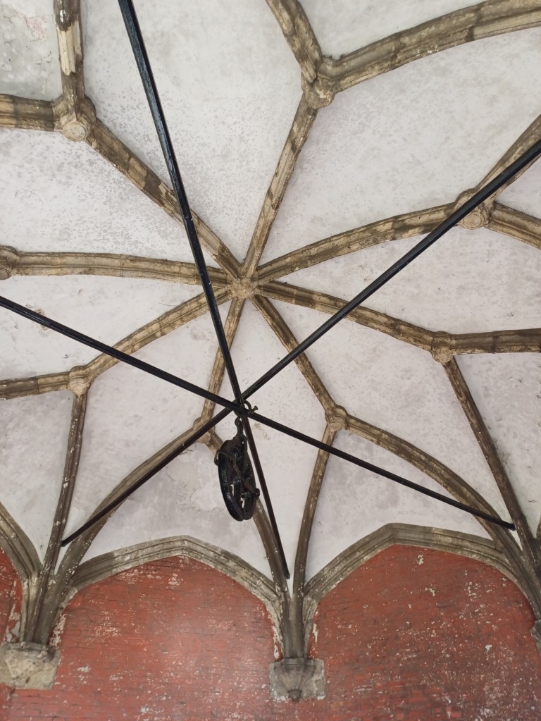 De waterput. Het regenwater dat op het dak van de Grote Kerk valt, wordt afgeleid naar deze put. En kijk eens naar dat gewelf bovenaan.