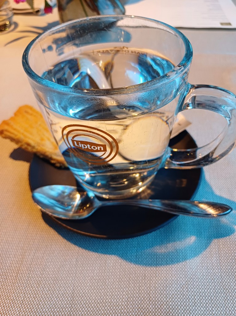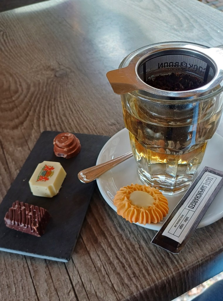 Na mijn rustpauze wandelden we verder. We gingen een terrasje doen onder een grote parasol. Heel handig, want even later regende het weer. Ik dronk een thee complet, oftewel een thee met drie Zeeuwse bonbons.