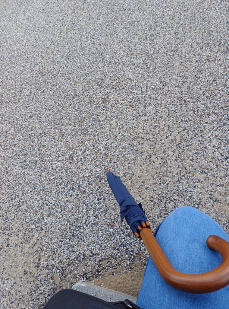 Even op een bankje zitten. En zo’n paraplu kan ook als wandelstok dienen. Geen haan die ernaar kraait, want die paraplu was misschien echt wel nodig met de dreigende wolken.