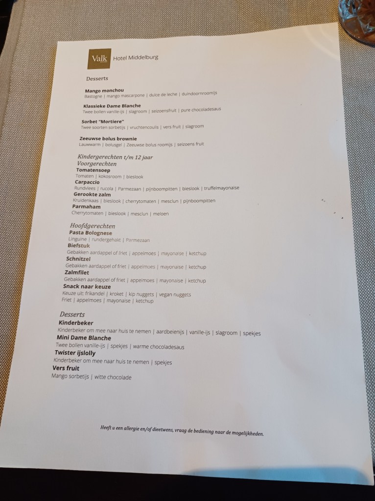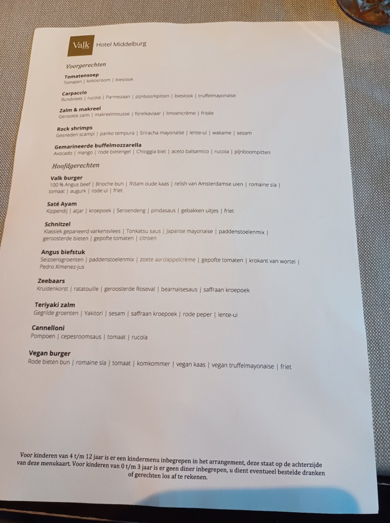 ’s Avonds was het tijd voor het driegangenmenu. Dit is een arrangement dat je kan boeken. Je krijgt dan een arrangementmenukaart en kunt daar uit kiezen.