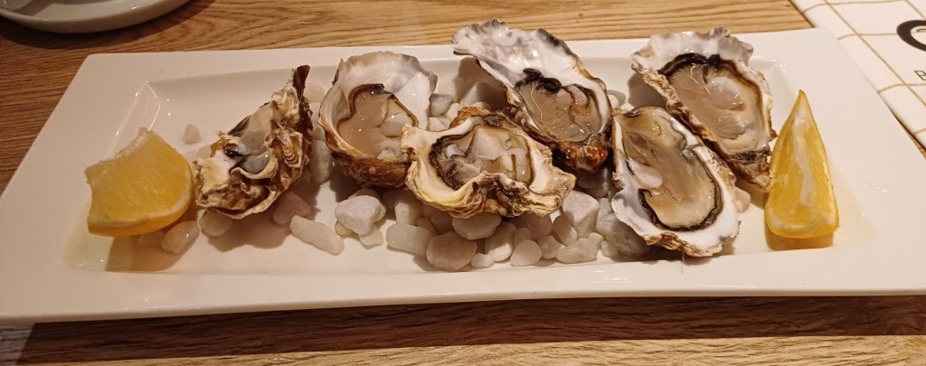 Ik proefde voor de allereerste keer in mijn leven een oester. Ik vond het best meevallen. Dit bordje hebben we trouwens onder ons vieren gedeeld.