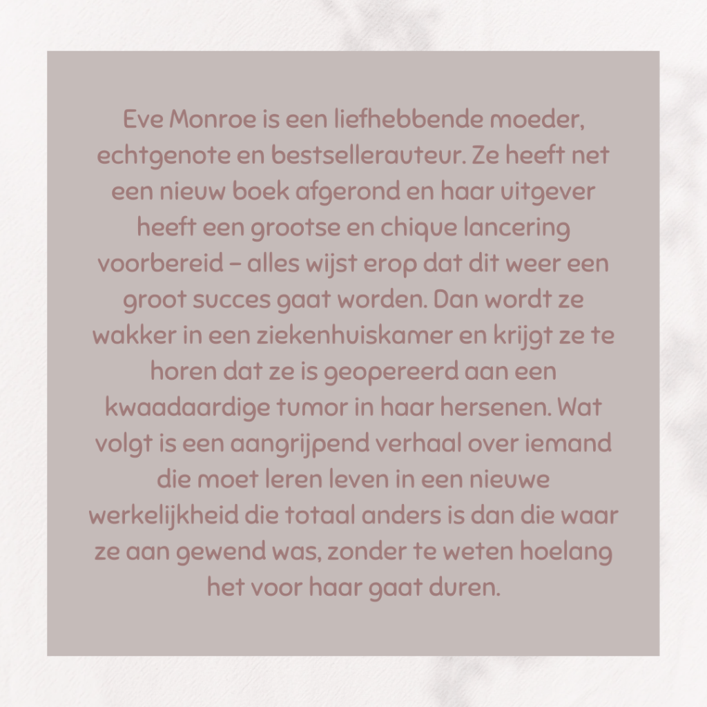 Een indrukwekkend en bijzonder verhaal. Het is fictie, maar tegelijkertijd ook autobiografisch, aangezien auteur Sophie Kinsella net als het personage Eve Monroe de kwaadaardigste vorm van hersenkanker heeft.