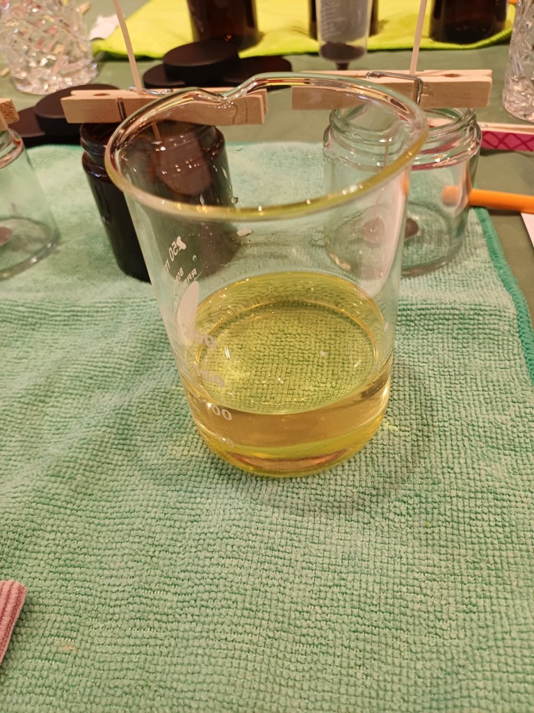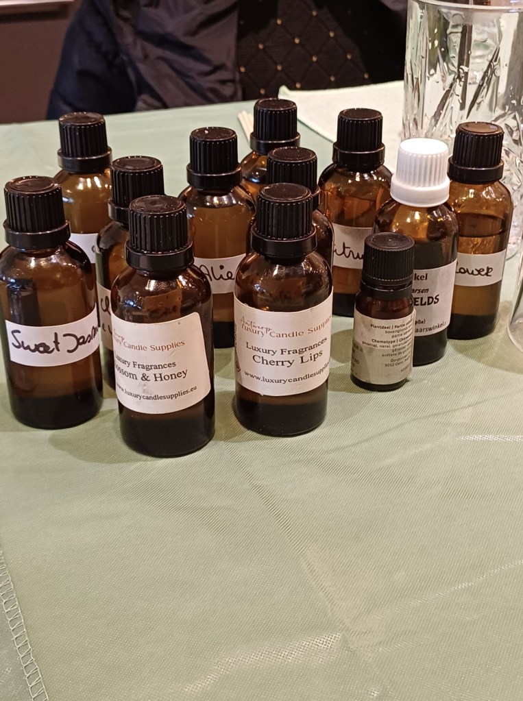 Het smelten duurt een kwartiertje. Tijd om de geurtjes te kiezen. Er was keuze in overvloed. Ik koos voor de citrusgeuren en een neutralere bloemengeur. Na verschillende geuren te ruiken, kan het zijn dat je niet meer goed kan ruiken. Dan kan je even aan gemalen koffie ruiken om terug te neutraliseren.