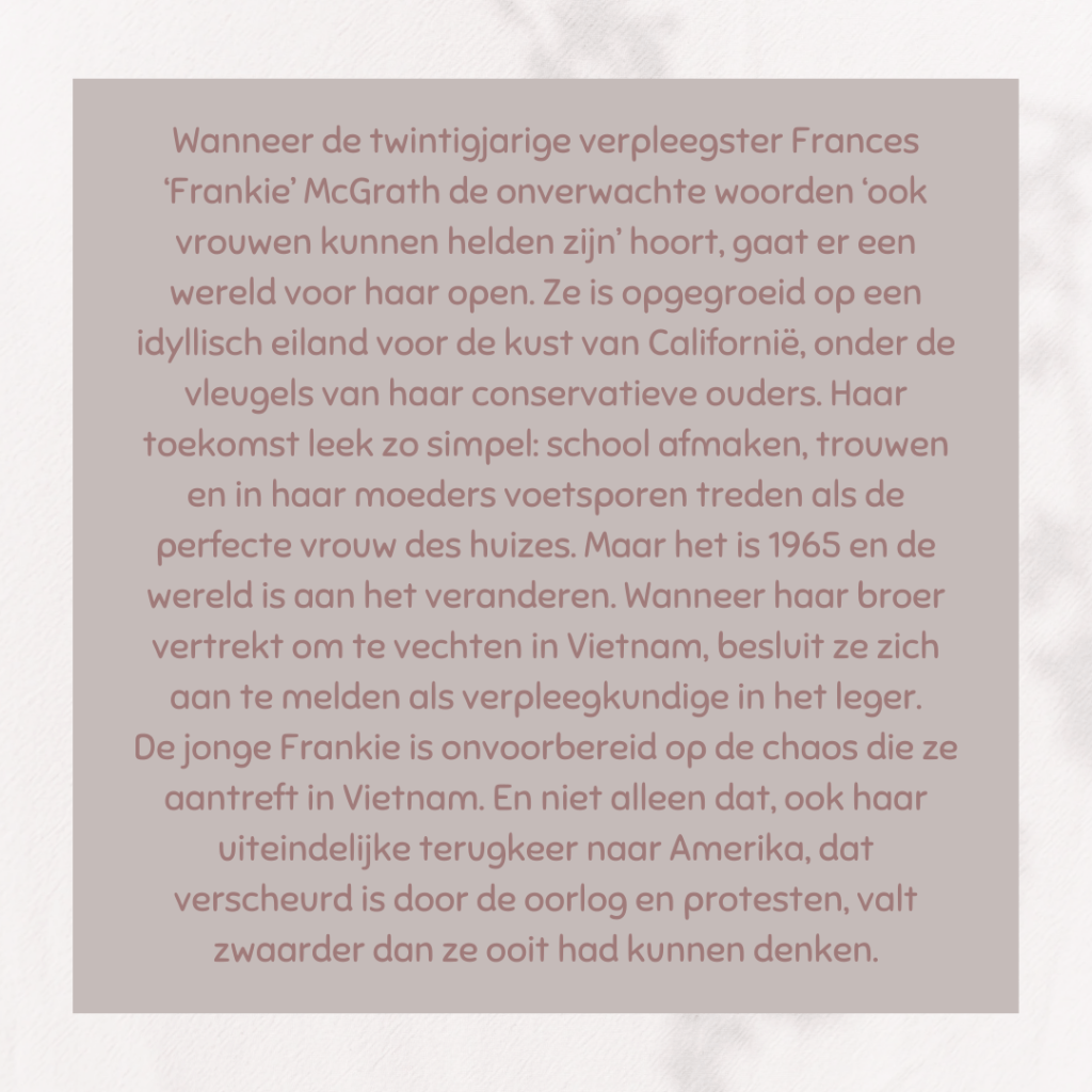 Dit boek is ontroerend, aangrijpend, leerrijk, gruwelijk, walgelijk, onwaarschijnlijk,… Het beschrijft de Vietnamoorlog (1955-1975) vanuit Amerikaans standpunt en de gevolgen daarvan voor de mensen die hun land gediend hebben. Het is een verhaal van rouw, verdriet, onmacht, woede, maar ook van vallen en weer opstaan. Het is een ode aan alle vrouwen die vergeten werden. Zij waren daar.