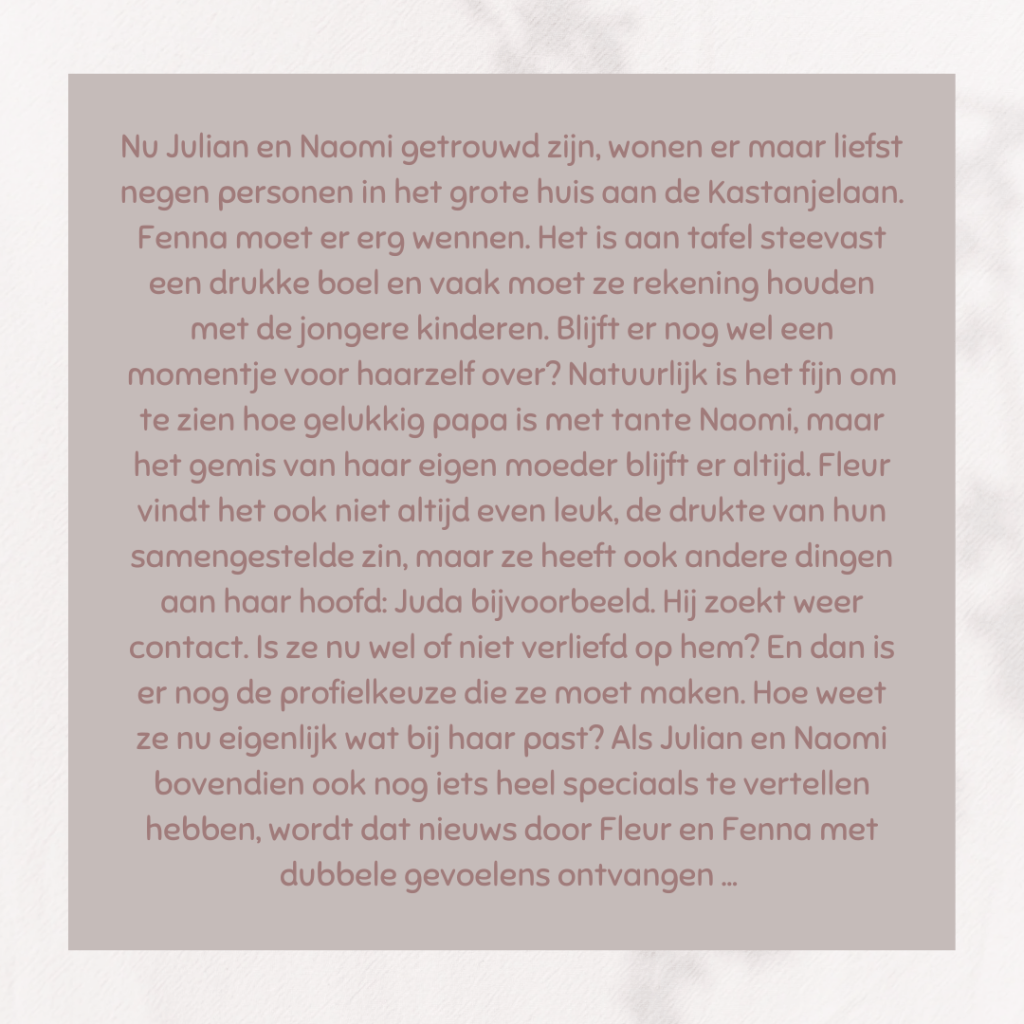 Het is een nieuw schooljaar en het nieuw samengestelde gezin beleeft weer heel wat. Vooral Fleur zit in de knoop met haar gevoelens en dat wordt goed en realistisch beschreven.