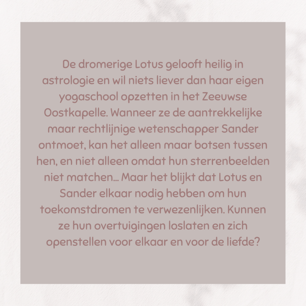 Dit is een heerlijk feelgoodverhaal. Het heeft een originele invalshoek door als thema astronomie en astrologie te gebruiken. Tegenpolen en dat zijn ook de hoofdpersonages. Maar soms staat ware liefde in de sterren geschreven…