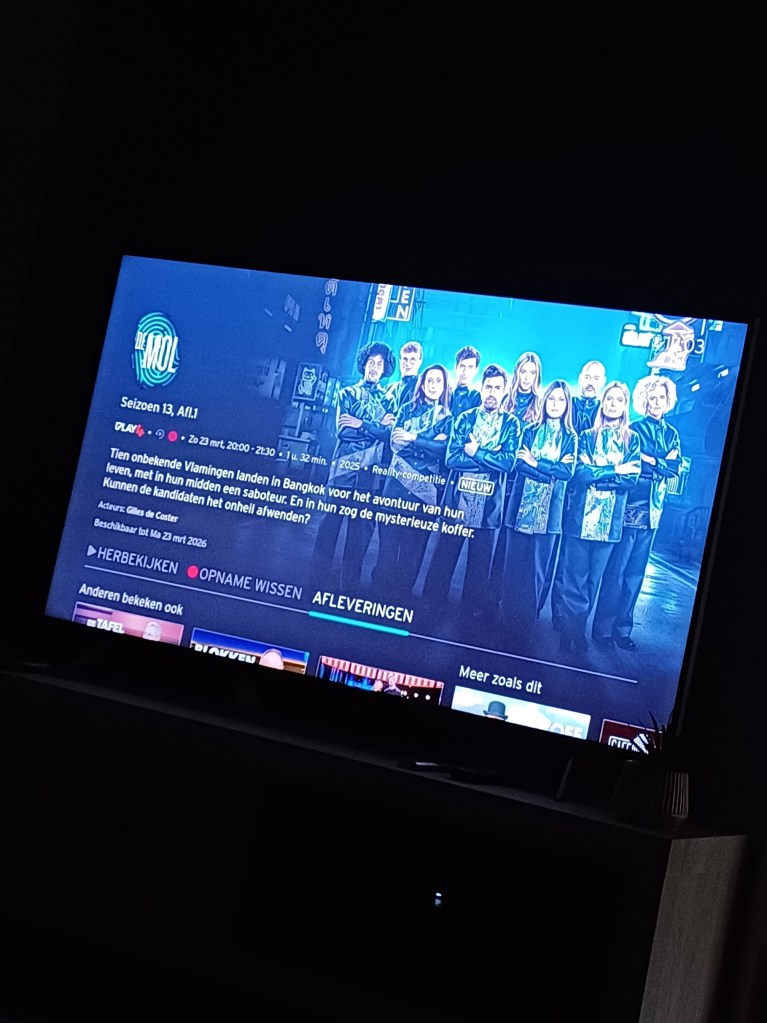 Nu ik het tv-scherm zie, herinner ik me iets. Ik ben afgelopen maand overgeschakeld van Telenet naar Base. Ik betaalde zo’n 87,00 euro per maand voor internet en tv. Een tv-pakket met zo’n 200 zenders waar ik amper naar keek. Nu heb ik een basis tv-abonnement met 24 Nederlandstalige zenders. NPO1-2-3 staan er ook tussen. Voor dit abonnement (internet en tv) betaal ik nu 50,00 euro. Ik zou er ook voor kunnen kiezen om tv via de apps (VRT Max, VTM Go of Play) te kijken, maar de ‘klassieke’ tv kan ik nog niet vaarwel zeggen.