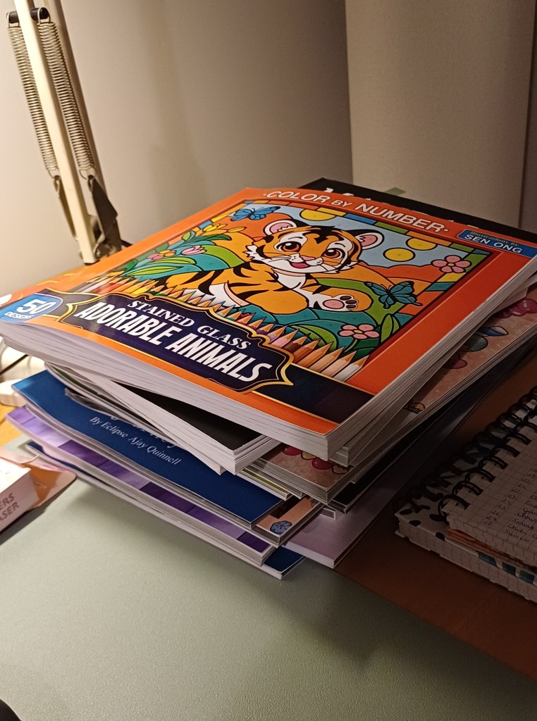 - Mijn stapel kleurboeken waarin ik heb gekleurd in maart.