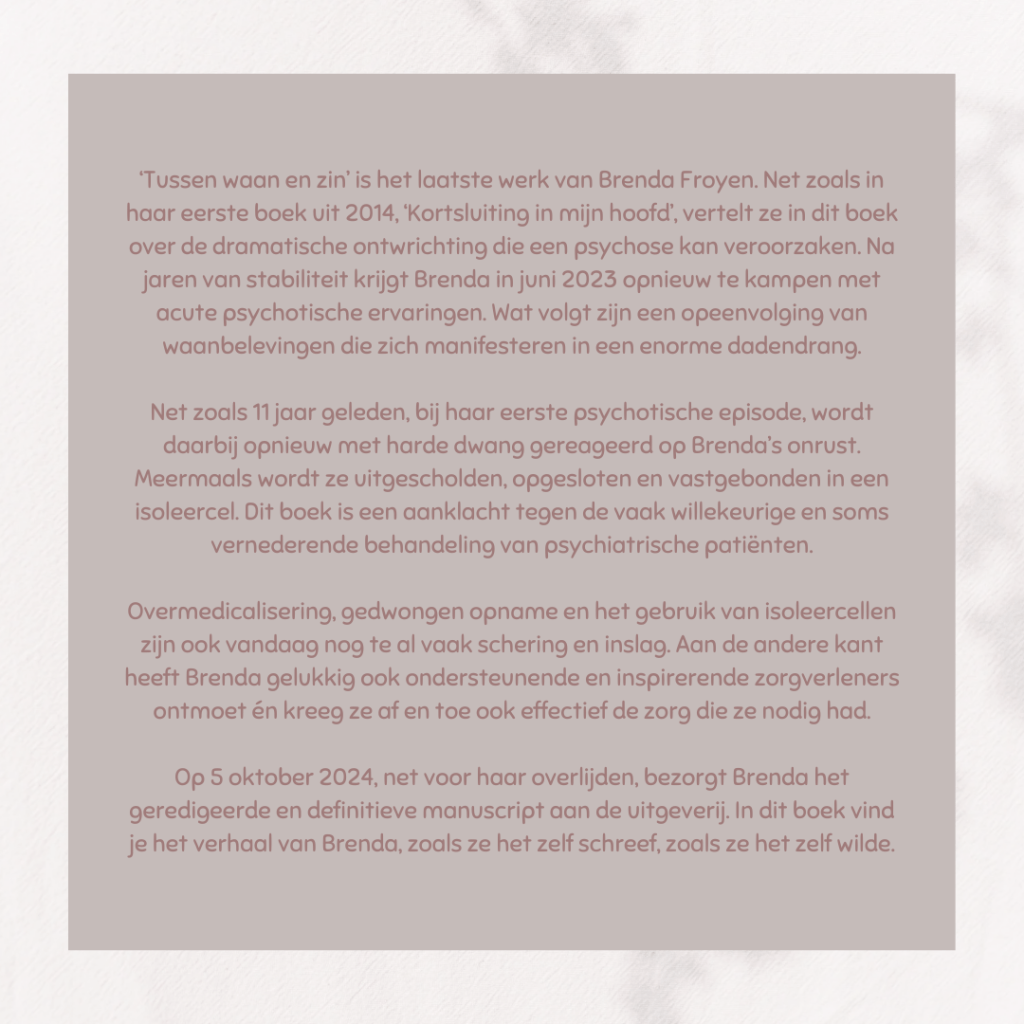 Op 5 oktober 2024 overleed Brenda onverwachts. Ik was daar zelf even niet goed van. Ik leerde haar kennen met haar eerste boek ´Kortsluiting in mijn hoofd´ tijdens een periode waarin het mentaal even niet zo goed met me ging. Het gevecht dat ze leverde voor een betere en menselijkere geestelijke gezondheidszorg maakte dat ik haar al die jaren nadien bleef volgen.