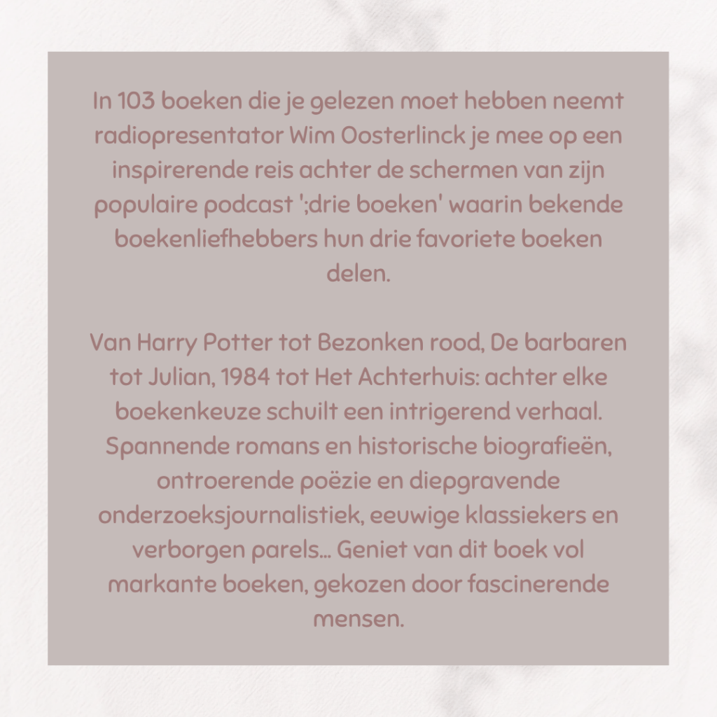 Het boek is gebaseerd op de podcast ´Drie boeken´ waarin bekende en minder bekende personen over hun top 3 boeken vertellen. Wim Oosterlinck heeft een mooie mengelmoes gemaakt van al deze boeken. Het enthousiasme en de liefde voor het boek spatten ervan af.