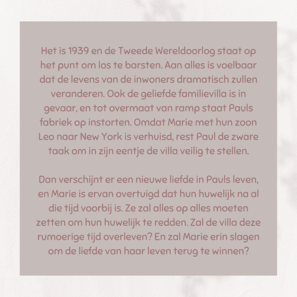 In dit boek is het rond 1935 en de NSDAP is in opmars. Ook de villa blijft niet bespaard van de politieke spanningen in Duitsland. In derde persoon worden de gebeurtenissen verteld in verschillende perspectieven. In het begin was het voor mij terug even zoeken naar de verhoudingen, maar doordat Anne Jacobs dit subtiel aanhaalt, zag ik de stamboom Melzer weer redelijk snel voor mij.