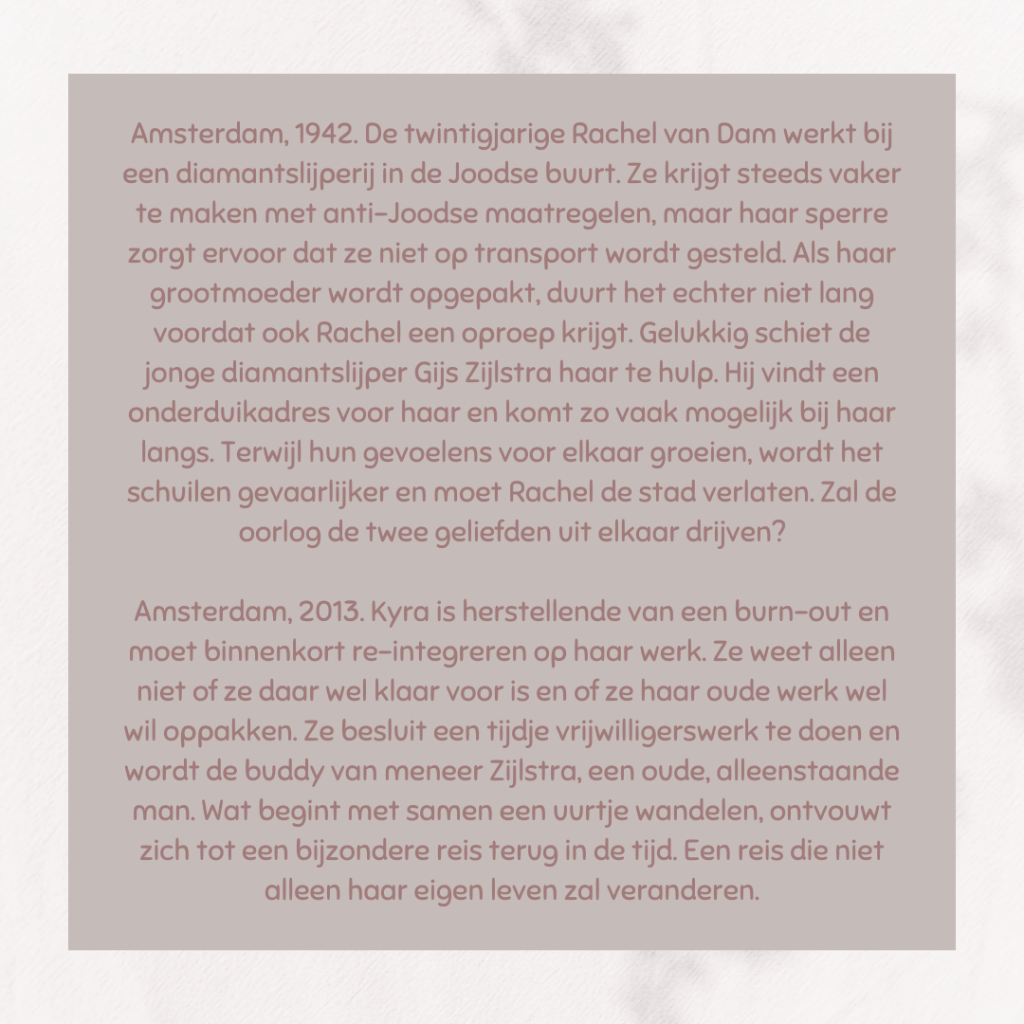 Prachtige oorlogsroman in een duale tijd. Enerzijds het schrijnende verhaal van Rachel die door haar joodse achtergrond gestraft werd voor wie ze was. Anderzijds is er het verhaal van Kyra die in contact komt met meneer Dijkstra. Beide verhalen komen samen in een prachtig einde.