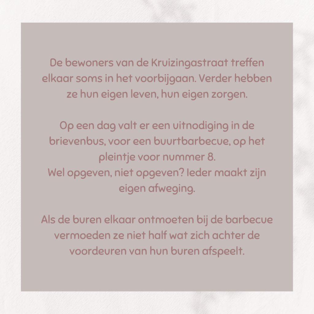 In dit boekje maken we kennis met de bewoners van de Kruizingastraat. Allen worden ze uitgenodigd voor de buurtbarbecue. Maar allen hebben ook hun eigen problemen achter de voordeur. Ieder huisje heeft z´n kruisje. De levensverhalen doen wat triest aan. Een heel vrolijk boek is het niet. Realistisch daarentegen wel.