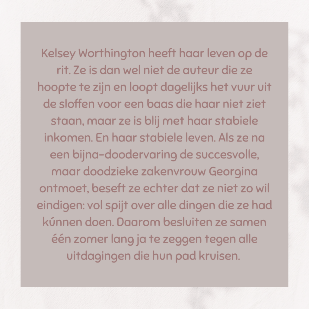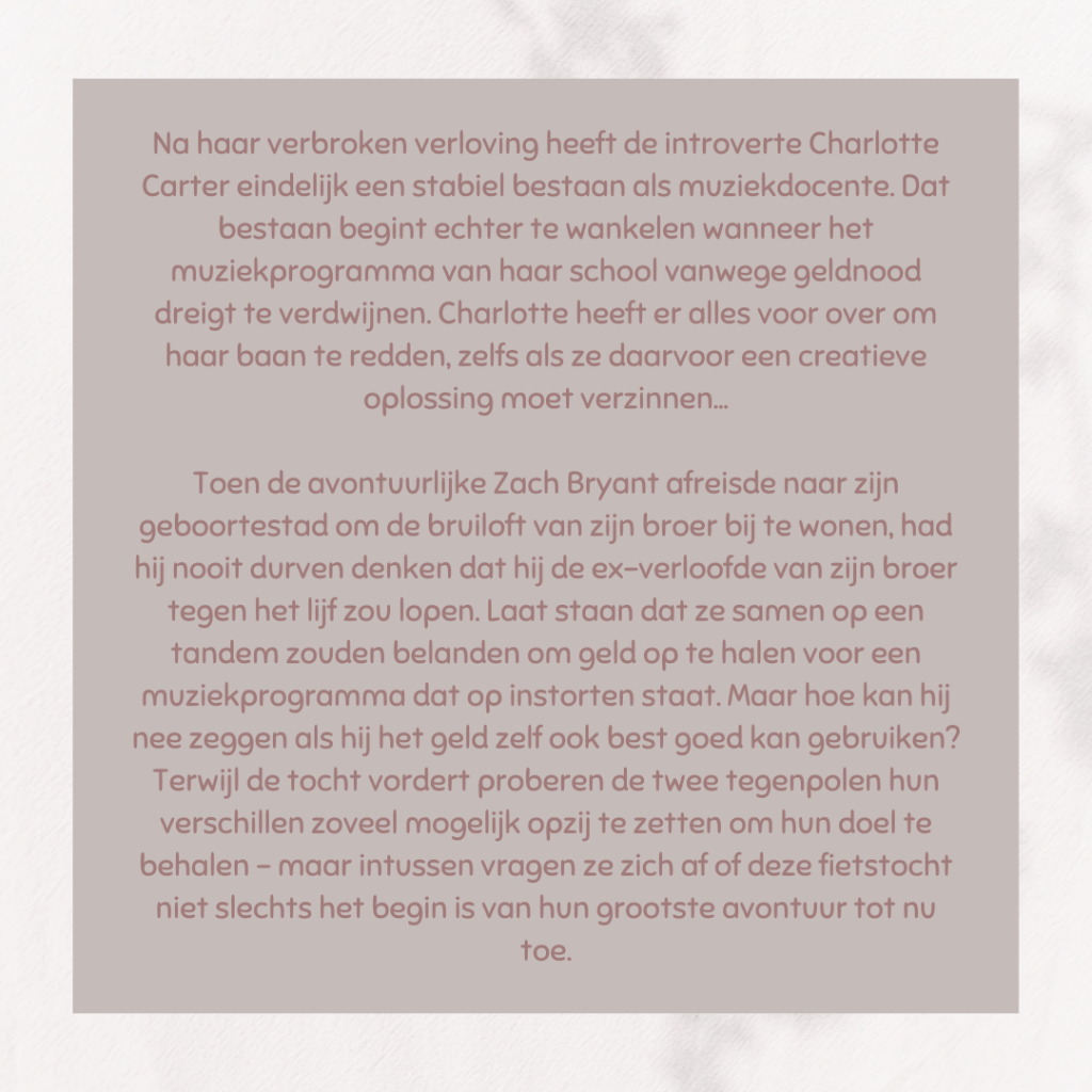 Heel fijne feelgoodroman/clean romance met twee geweldige personages die aan elkaar gewaagd zijn. Het verhaal heeft ook de nodige humor waardoor je regelmatig moet glimlachen.