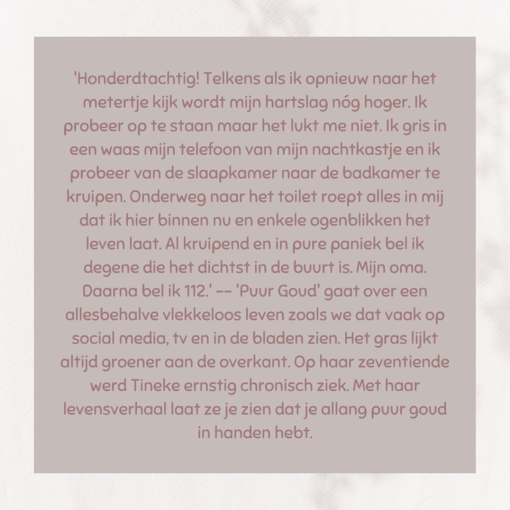 Interessant verhaal over een persoon met een chronische ziekte. Ze vertelt over haar leven met de ziekte van Sjögren en ITP. De titel wijst op dat je gezondheid puur goud is. En zelfs als er een ziekte is, heb je nog gouden momentjes. Dat maakt Tineke duidelijk met haar omgekeerde bucketlist.