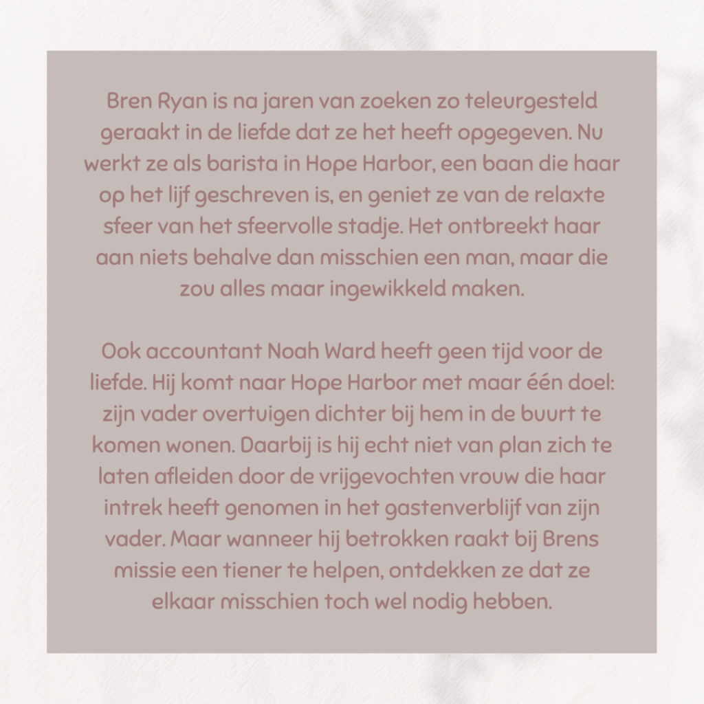 Met dit elfde deel van de populaire Hope Harbor-serie laat Irene Hannon je weer volop genieten van het kustplaatsje in Oregon. De hoofdpersonages zijn nieuwe personages, maar daarnaast komen ook oudere hoofdpersonages aan bod. Al ga ik wel eens een lijstje moeten maken met naam, partner en beroep, want na 11 boeken weet ik het niet meer. 😁